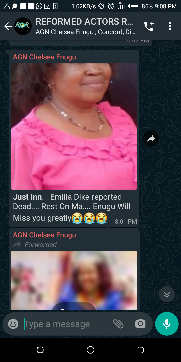 According to the official announcement released by the National Assistant secretary of the Actors Guild of Nigeria AGN Miss Chelsea Nwodo on the Actors Guild of Nigeria's official Memebers WhatsApp group, the death of Mrs Emilia Dike An Enugu based Nollywood star has occurred.
