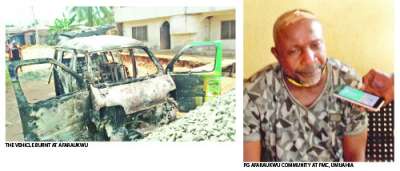 Speaking on the incident, one of the Village Heads, Chief Ben Ohaeri, said that Doris deliberately wanted to disrupt the community road project apparently to prove her “powerful influence”, adding that after the President General was rushed to the hospital, Doris’ brother blocked the junction leading to their building with a mini bus which was later burnt in the night apparently to create the impression that they were attacked by the community. “Isiama Afaraukwu is peace -loving; we accept strangers but this can never happen in Item where she comes from; so, we want her to leave our community”.
